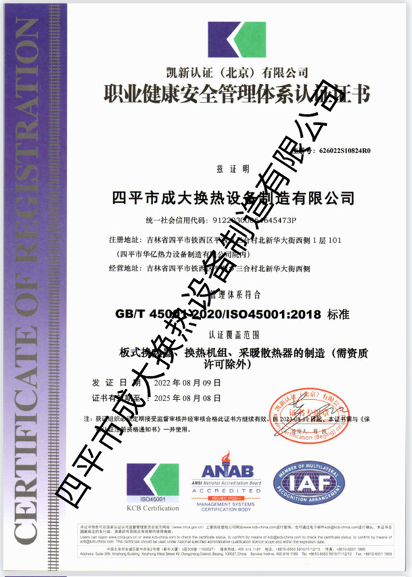 職業(yè)健康安全管理體系認證證書